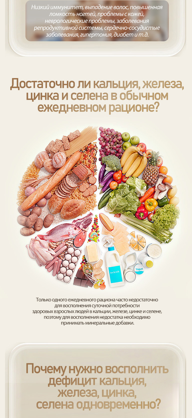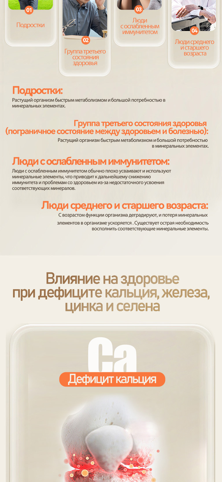 Исследования показали, что многим людям зачастую не хватает кальция, железа, цинка и селена одновременно. В этом случае добавление только одного минерала не поможет улучшить здоровье.