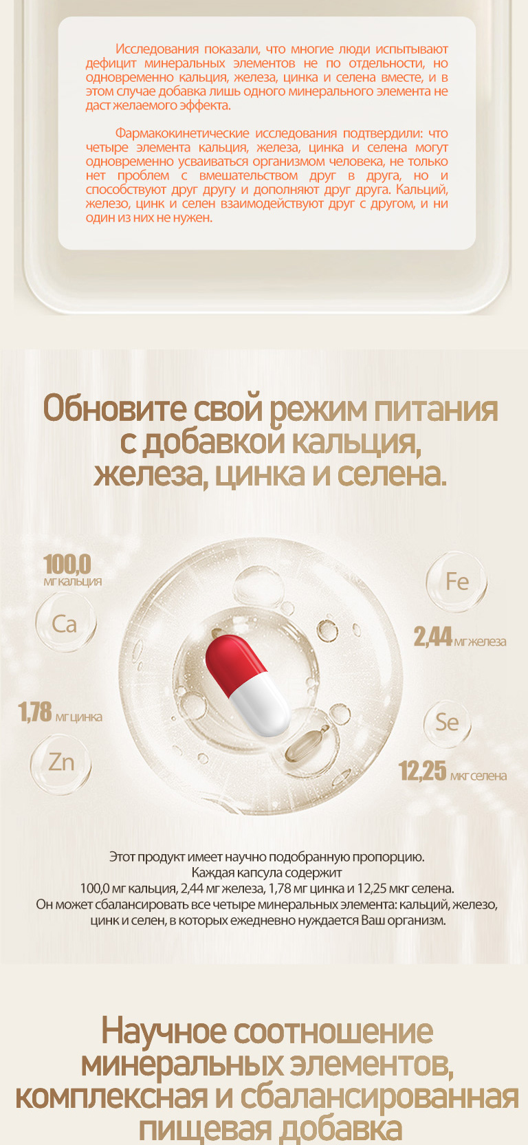Фармакокинетические исследования подтвердили, что четыре элемента – кальций, железо, цинк и селен – могут усваиваться организмом человека одновременно, при этом не препятствуют усвоению друг друга в организме, а даже наоборот, стимулируют!