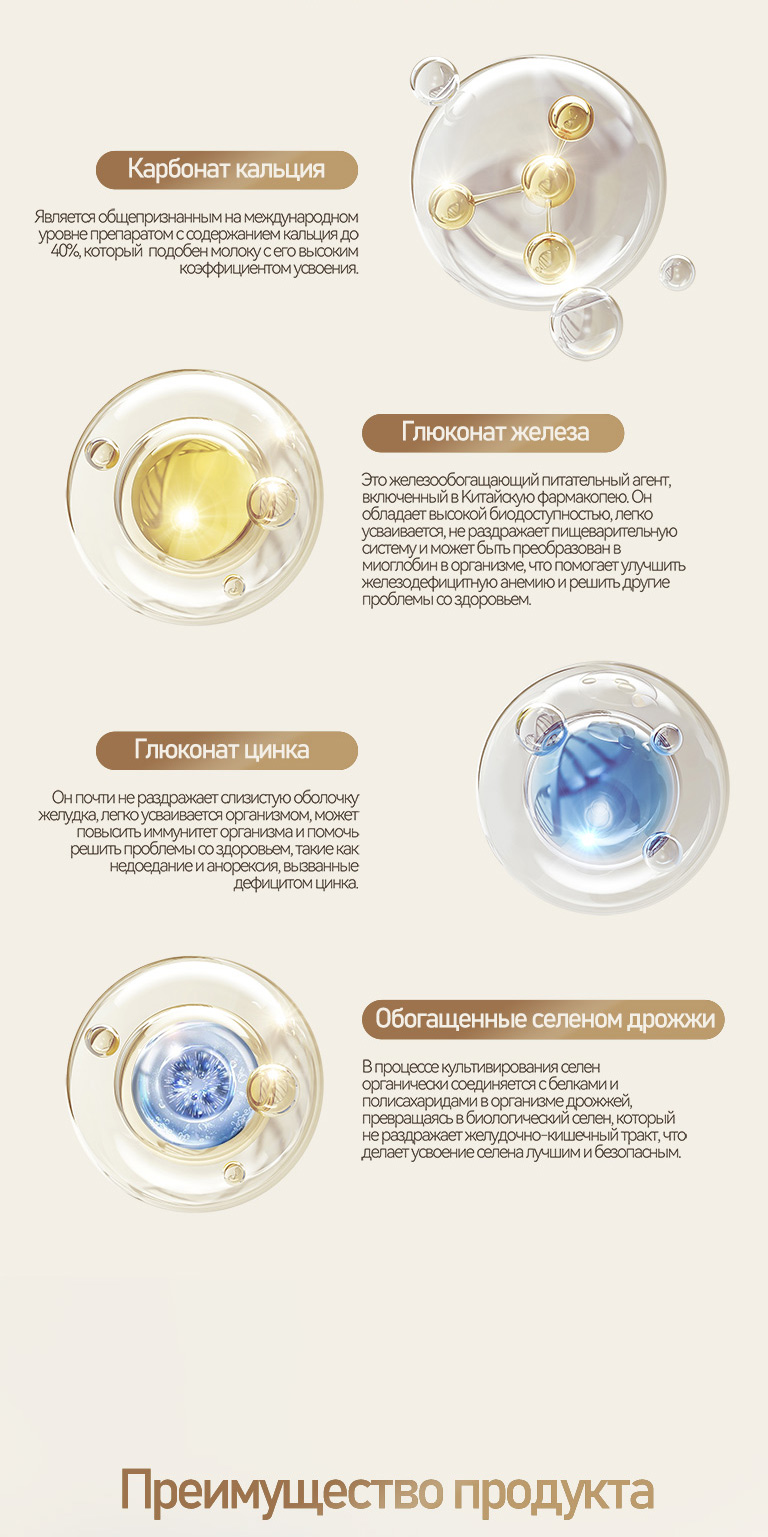 Показание к применению: дефицит железа, кальция, цинка и селена.